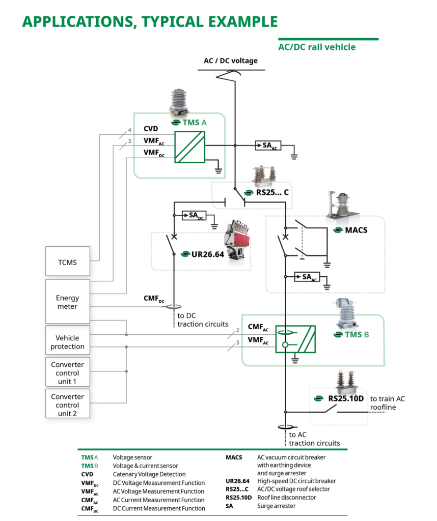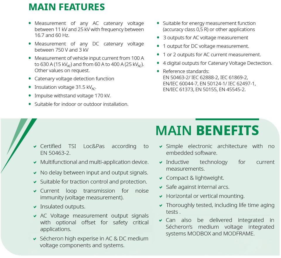 The TMS is Sécheron’s product platform for medium voltage and current measurement transducers class 0,5 R for AC and AC/DC rail vehicles. It delivers AC & DC voltage and AC current signals to various on-board equipment such as the energy meter, converter control units, vehicle control unit and vehicle protection devices. With its new integrated Catenary Voltage Detection (CVD) function, the TMS voltage and current sensor identifies and informs the train control unit of the line voltage of the network on which it is operating, whether it is AC or DC. It also delivers a DC Voltage Measurement signal class 0,5 R suitable for the energy metering.