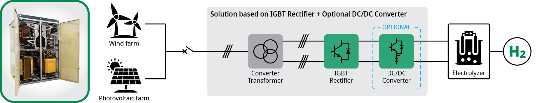 Depending on the requirements and chosen solution, Sécheron can propose modern power supply for electrolysers. Sécheron rectifiers developed specifically for H2 electrolysis application are of a cutting-edge design and propose various modern features, such as possibility to deliver reactive power to the grid and low-voltage ride through. These are especially important for weak grids and grids fed by renewable sources of energy.
