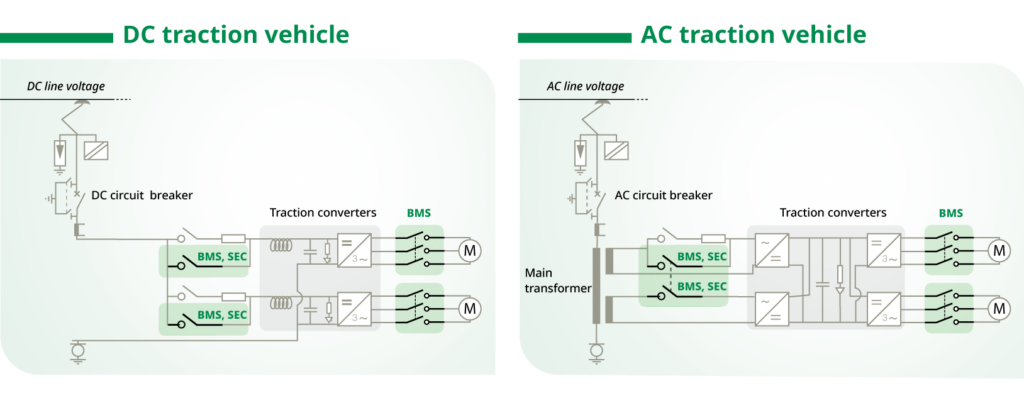 - The BMS & SEC ranges are used as separation contactors on AC vehicles, line contactors on DC vehicles, roof line contactors on locomotives, and protection contactors for Permanent Magnet Synchronous Motors, among other applications.