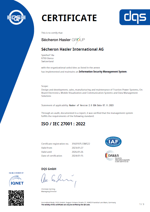 Sécheron’s Traction Power Systems business unit has achieved ISO/IEC 27001:2022 certification, underscoring our ongoing commitment to information security.